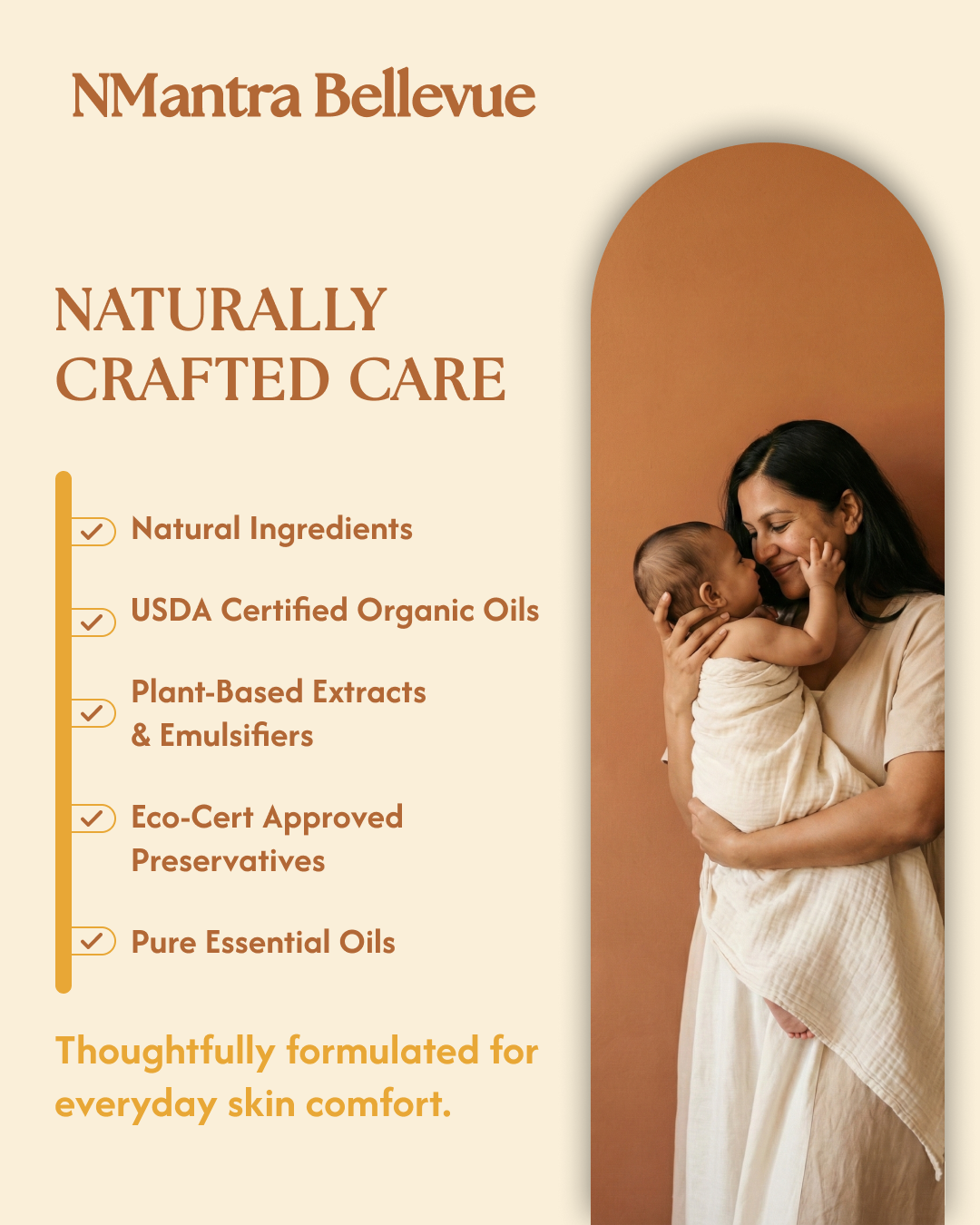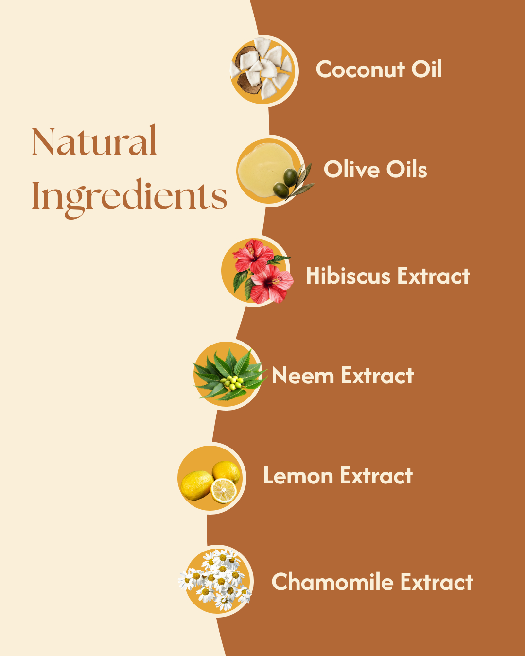 Distilled Water, Organic Castor Oil, Coconut Oil, and Olive Oils, Hibiscus Extract, Neem Extract, Lemon Extract, Chamomile Extract, Blend of Essential Oils